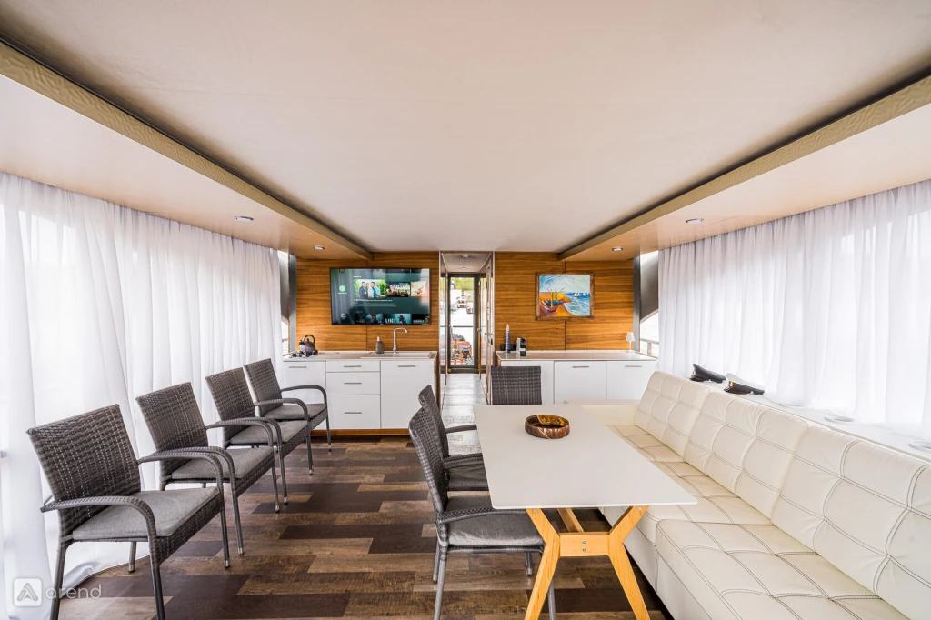 Дополнительная площадка для проведения мероприятий на верхней палубе (можно организовать небольшие прогулки по воде с фуршетным столом, разместить DJ с пультом)