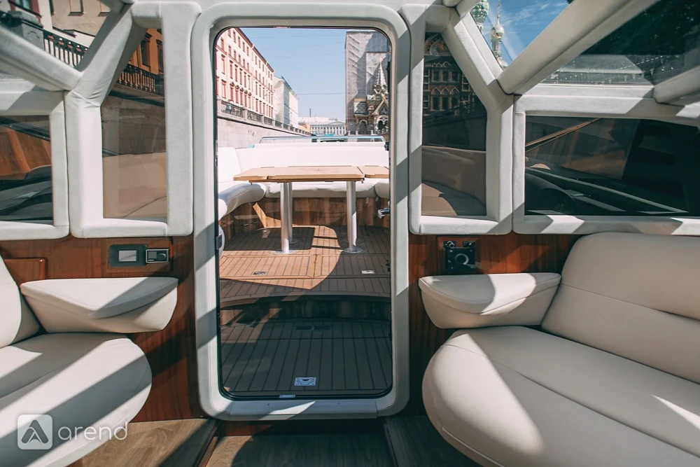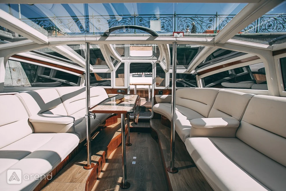 На открытой части яхты расположен диван и столик.