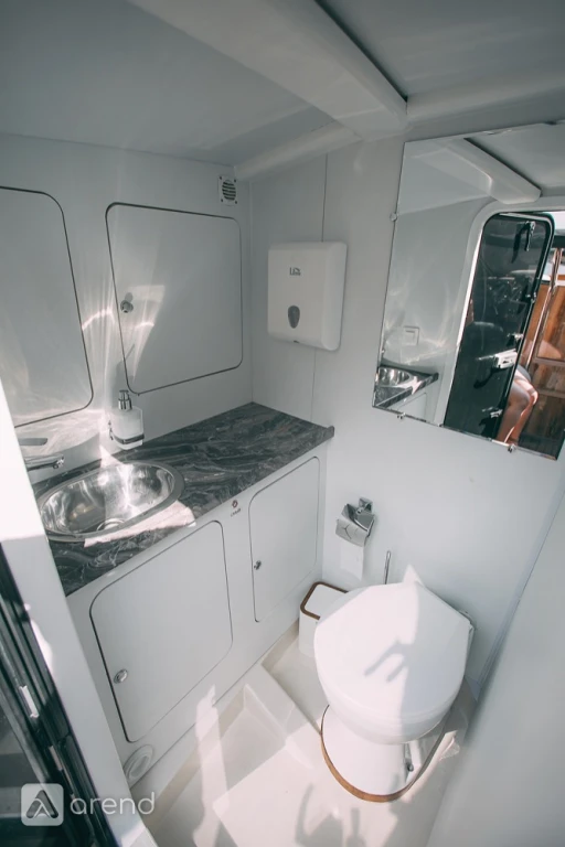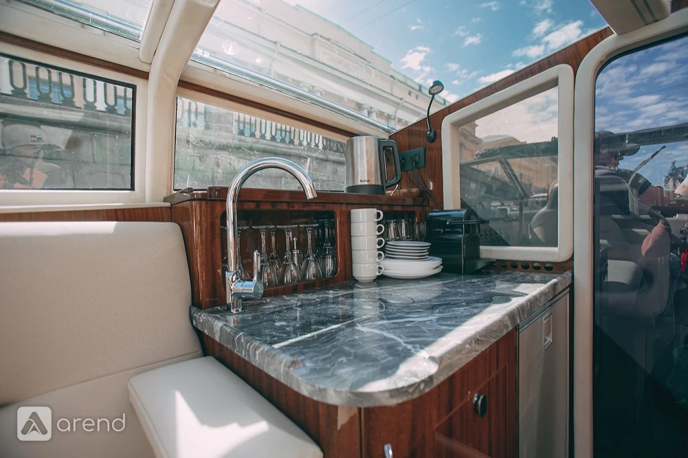 Оборудование на борту включает в себя туалетную комнату, обогреватель, пледы, кондиционер, мини кухню с посудой для сервировки, холодильник, чайник, кофемашину.